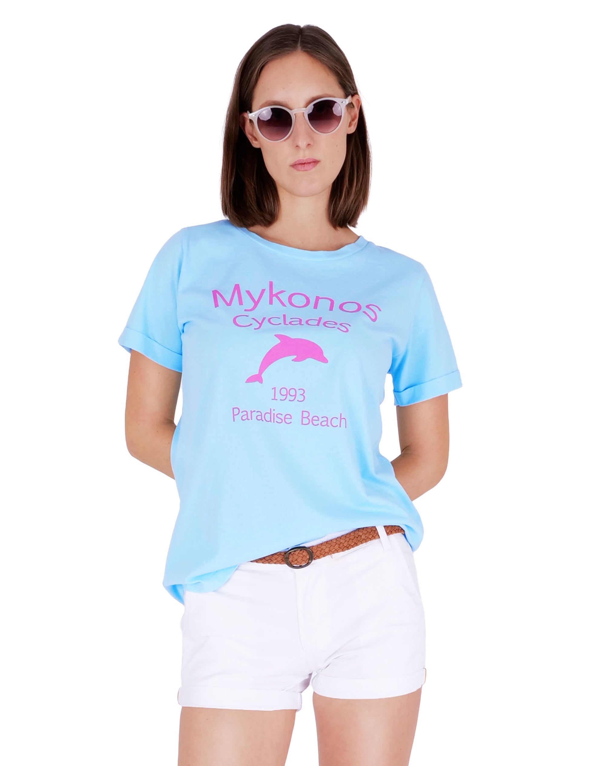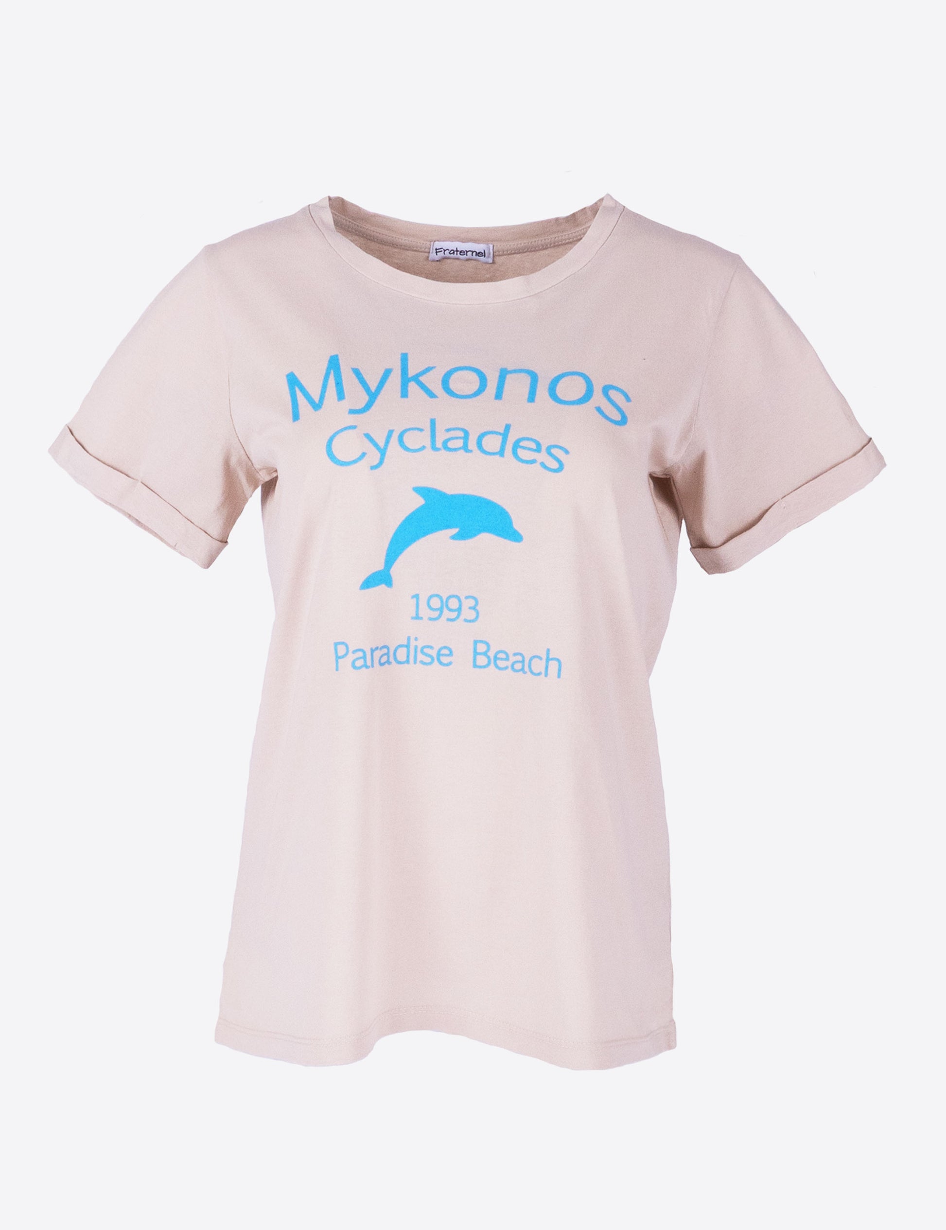 Fraternel Damen T-Shirt Mykonos Print, Printshirt mit Delfin Motiv und sommerlichem Mittelmeer Flair T003